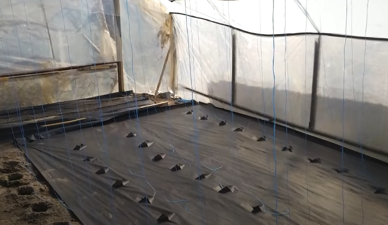В следующий раз, когда мы будем сажать в эту теплицу огурцы (сажать мы их будем осенью), мы просто сделаем лунки в этих же отверстиях, дрелью со специальной насадкой. То есть, не снимая спанбонд мы "продрелим" лунки и посадим туда огурцы. Осенью мы уберём спанбонд, перепашем землю. Весной ещё раз перепашем землю и этот же спанбонд, с прорезанными отверстиями, мы опять ровно разложим по этой теплице. И нам уже не нужно будет размечать где делать лунки, так как лунки мы будем делать в вырезанных отверстиях.