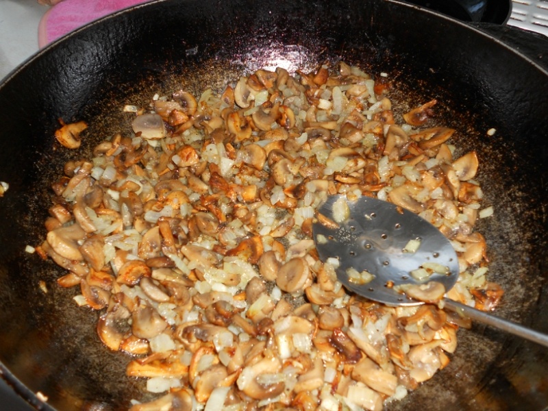 Сначала нужно разогреть на сковороде растительное масло, обжарить в нем мелко нарезанные шампиньоны и репчатый лук. Жарить до полной готовности.