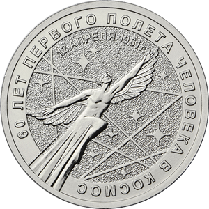 По поводу оборотки официальный источник говорит нам следующее: На оборотной стороне монеты номиналом 25 рублей (каталожный № 5015-0057) расположено рельефное изображение летящей фигуры человека с крыльями на фоне стилизованного изображения звездного неба; имеются надписи, вверху по внутренней окружности: «12 АПРЕЛЯ 1961 г.», на кольце: «60 ЛЕТ ПЕРВОГО ПОЛЕТА ЧЕЛОВЕКА В КОСМОС».