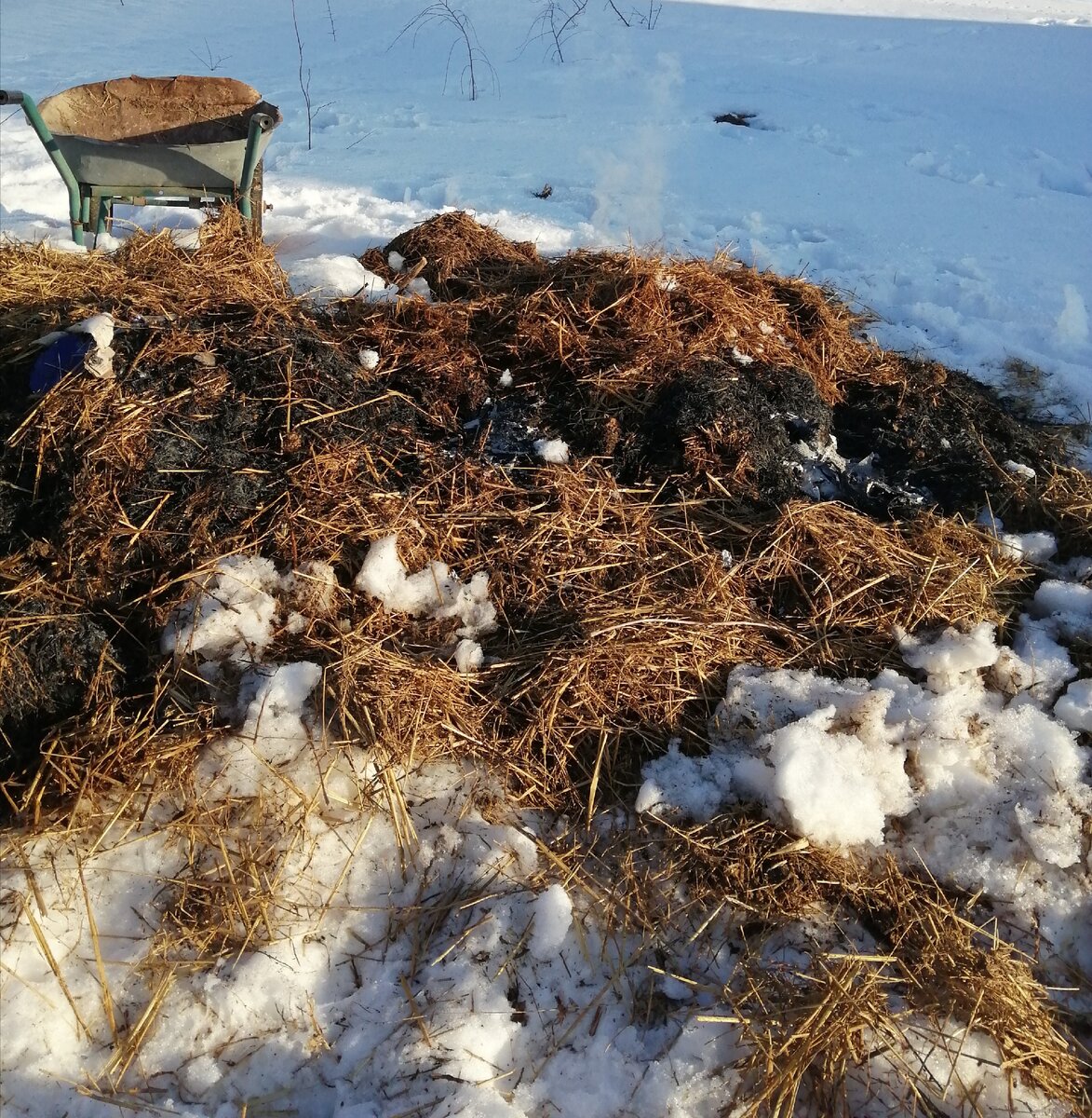 Итак, у меня лежит навоз, часть где соломы слишком много я просто сжигал её, конечно же соблюдая технику безопасности.