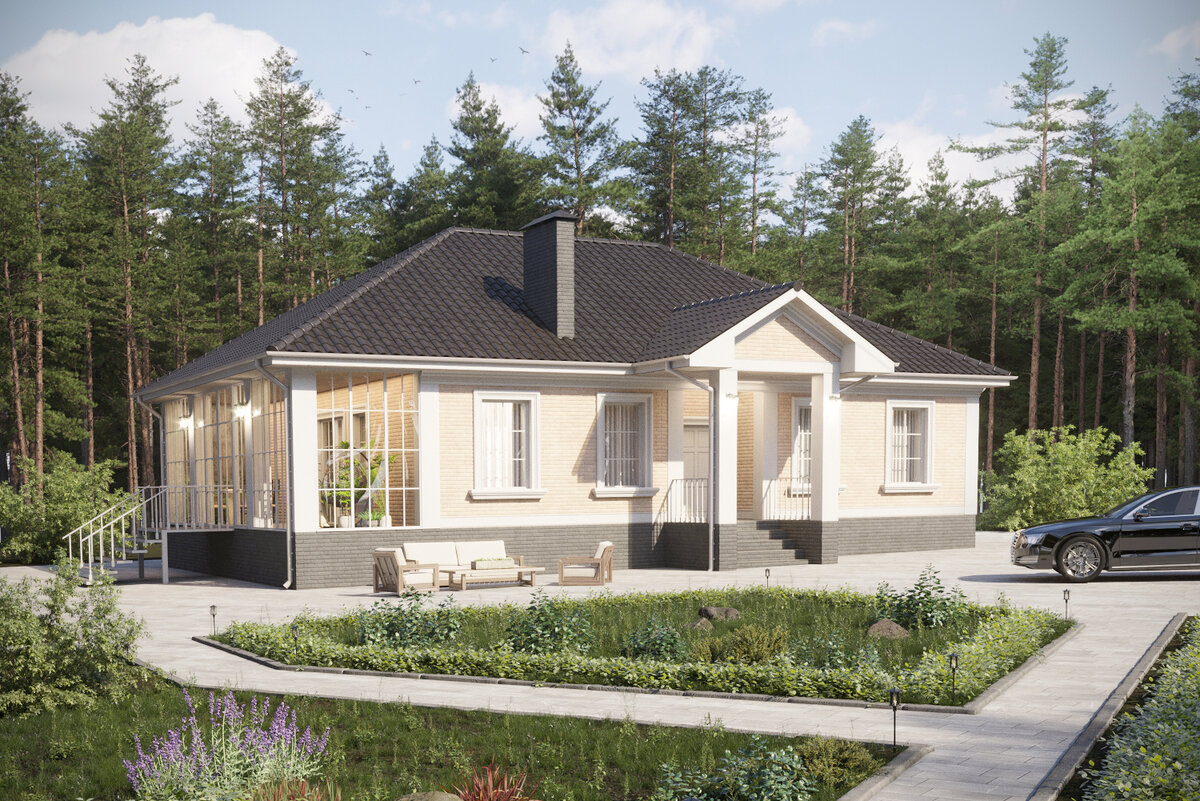 Стилевое решение одноэтажного дома проекта 06-46 приближается к классицизму: простота форм, прямая геометрия, склонность к симметрии придутся по душе любителям архитектурных традиций.