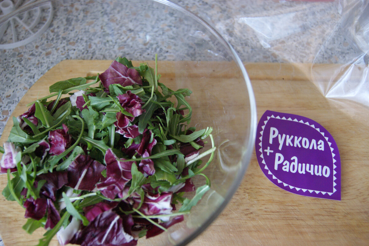 Рукколу и Радичио выкладываем в емкость, где будем смешивать салат, рукколу я немного режу, честно кто как любит (она придает горчинку салату).