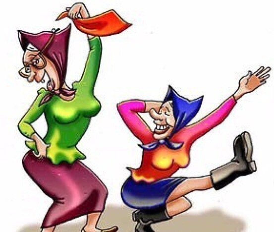 Сцена представляет собой фойе клуба. Доносятся звуки музыки – рядом идёт дискотека. На сцену выходят Натаха и Танюха. Они одеты и причёсаны по молодёжному, в руках у Бабы Танюхи – хозяйственная сумка на колёсиках. Баба Натаха – глухая, ничего не слышит, всё переспрашивает. На руке у каждой «девчонки» – рукав от тонометра, сами тонометры – в карманах, к ним тянутся жгуты. Бабульки ковыляют шаркающей походкой, держатся друг за друга, оглядываются по сторонам.