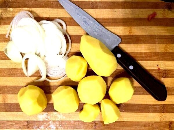 2. Далее режем картошку и лук в форме колец.