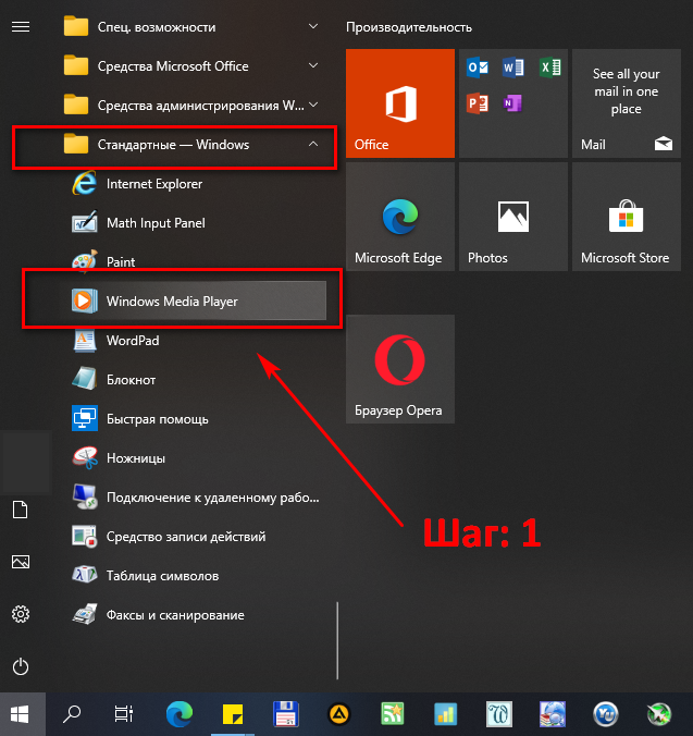 Шаг 1: откройте меню «Пуск», прокрутите ползунок вниз, раскройте папку «Стандартные», выберите «Windows Media Player».