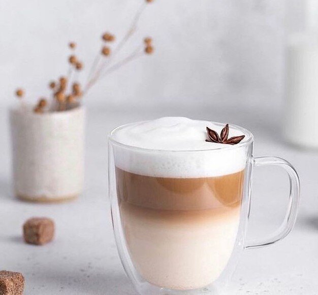 Затем аккуратно перелейте молоко с пеной в красивый бокал, и после медленно влейте тонкой струйкой эспрессо, таким образом в таре будут видны слои молоко светлый и кофе темный, это очень красиво, можно украсить специями, корицей или сделать собственный авторский декор.
