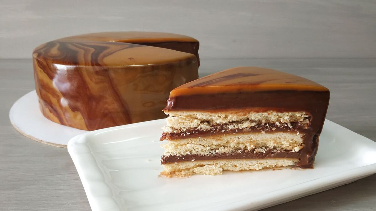 Этот торт чем-то напоминает батончик Twix. В его основе песочные коржи, которые прослаиваем шоколадным муссом и карамелью. Сверху торт полит карамельной зеркальной глазурью. Получился простой, строгий, но очень вкусный десерт.