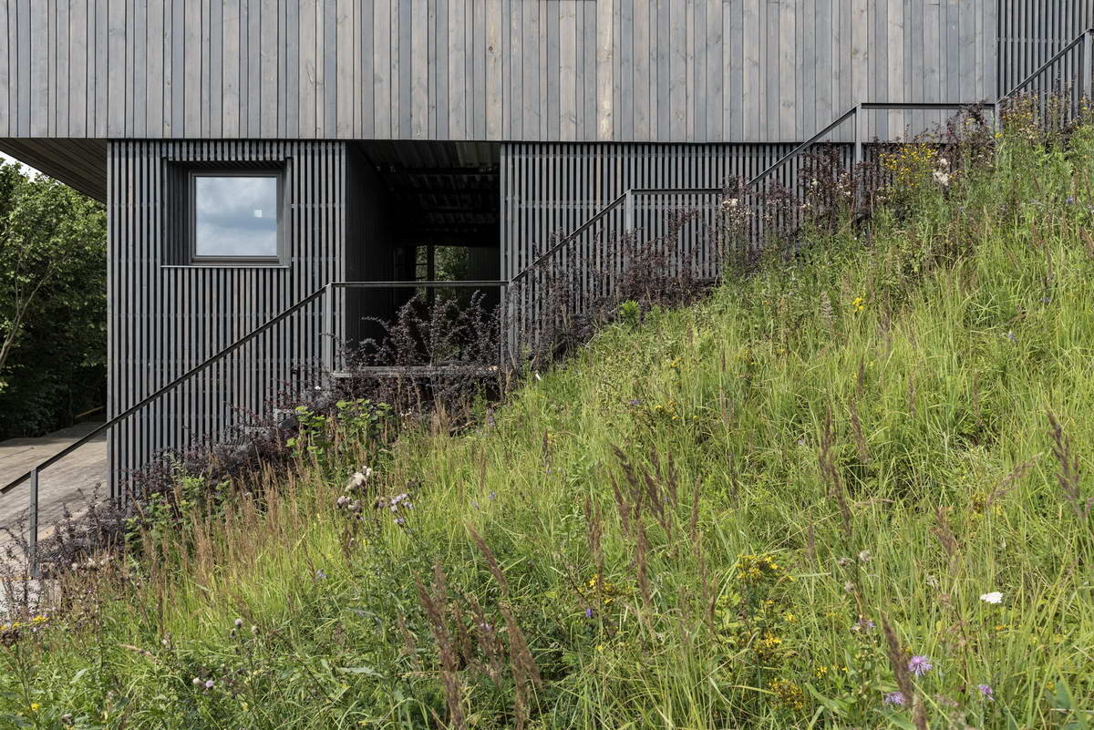 Так, со стороны плоского фасада оборудована лестница, а противоположный фасад имеет выразительные подрезы, обусловленные необходимостью разбивки террасы — чтобы была возможность пребывания рядом с домом на свежем воздухе.Здание имеет несколько вариантов обхода за счет оборудования сквозного пассажа в среднем уровне, внешних лестниц, примыкающих к стенам, большой террасы у основания постройки и деревянного моста шириной 4 метра, обеспечивающего доступ к участку и верхнему уровню.