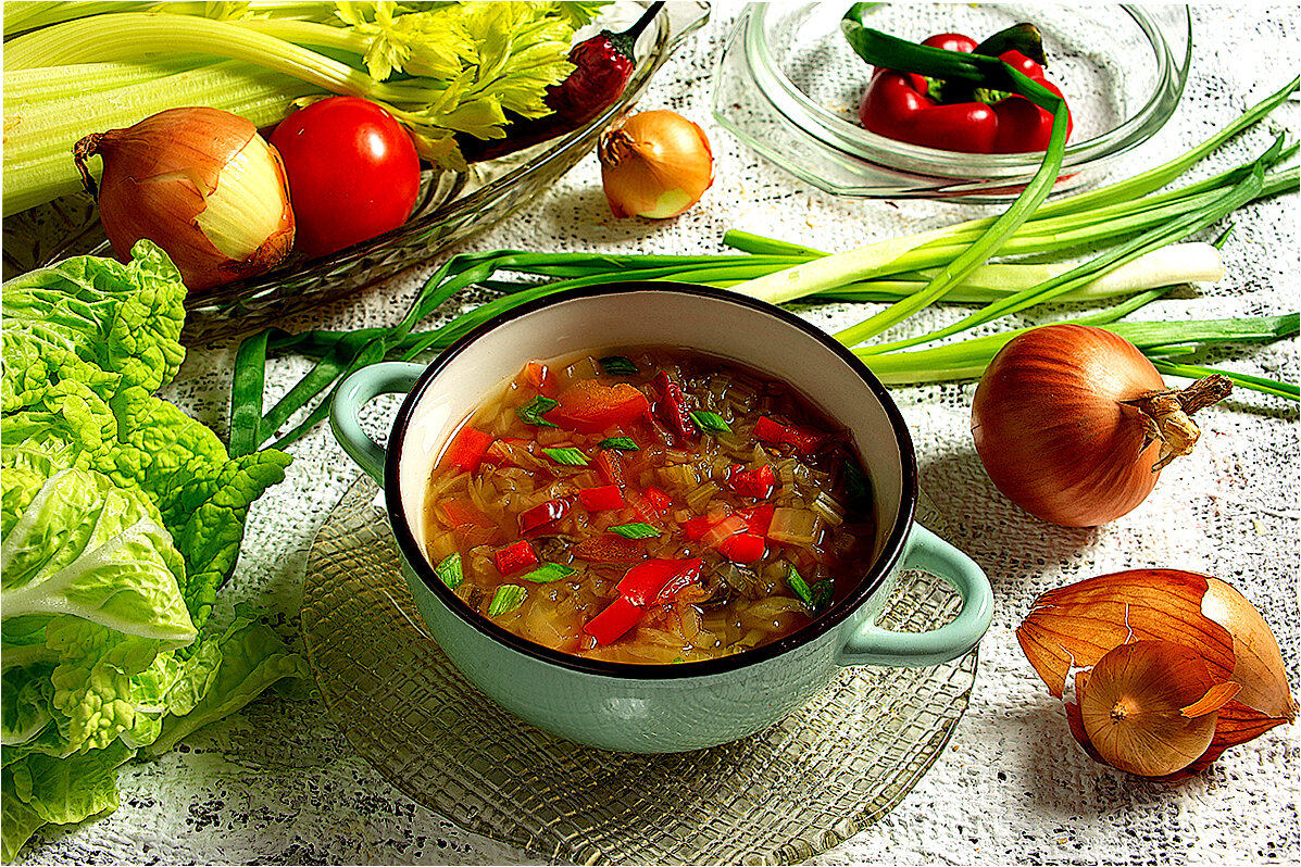 - луковый супчик имеет очень маленькую калорийность и потому организму приходится тратить более калорий на переваривание этого супчика, чем получать с ним