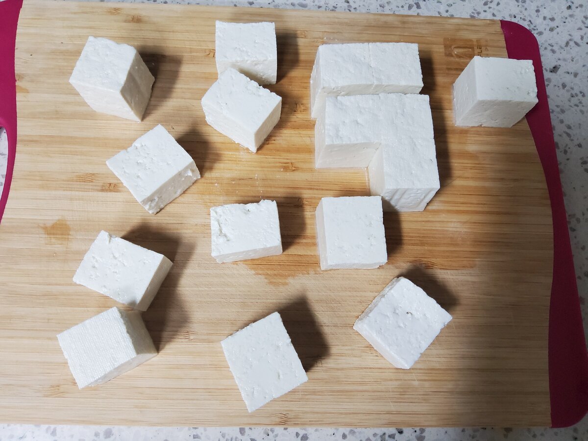 1. Тофу обтереть бумажным полотенцем, дав впитаться лишней жидкости, нарезать на крупные кусочки. Если вы покупаете тофу азиатского происхождения, то обратите внимание, что он бывает нескольких видов. В данном случае нужен будет тофу ( по-корейски тубу - 두부) для жарки ("Пучим" - "부침").