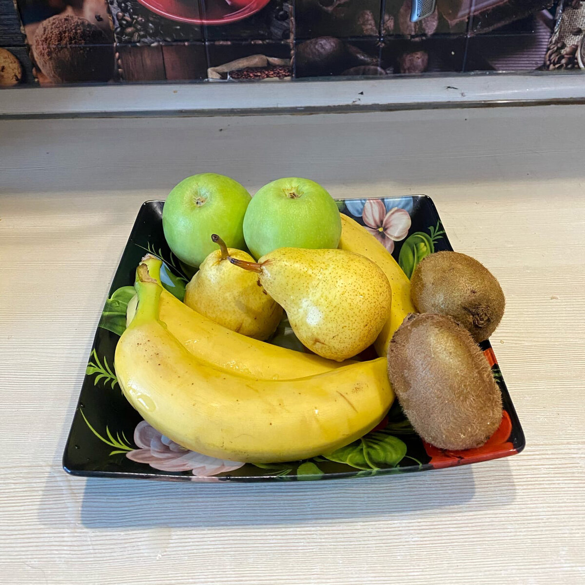 Для приготовления салата подойдут любые фрукты, которые имеются в наличии. Сегодня у меня есть яблоко, бананы, груши и киви.