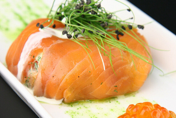 6. Снять пленку. Выложить полученное изделие на блюдо и украсить ч.л. икры и пучком микрозелени.