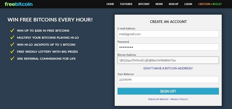 Для регистрации переходим на официальный сайт FreeBitco.in и сразу же видим форму регистрации. Заполняем все указанные поля (e-mail, пароль и Bitcoin адрес), где Bitcoin адрес – это Ваш счет в Биткоин кошельке (для заработка Биткоинов у Вас должен быть Биткоин кошелек, если его нет, то его можно быстро создать).
