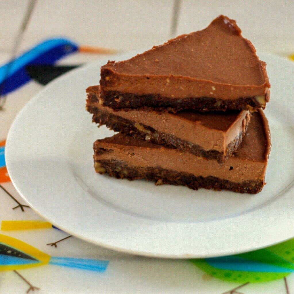 Выложите крем на основу из орехов и фиников, равномерно распределите. Поставьте в морозилку на 30 минут. Готово!