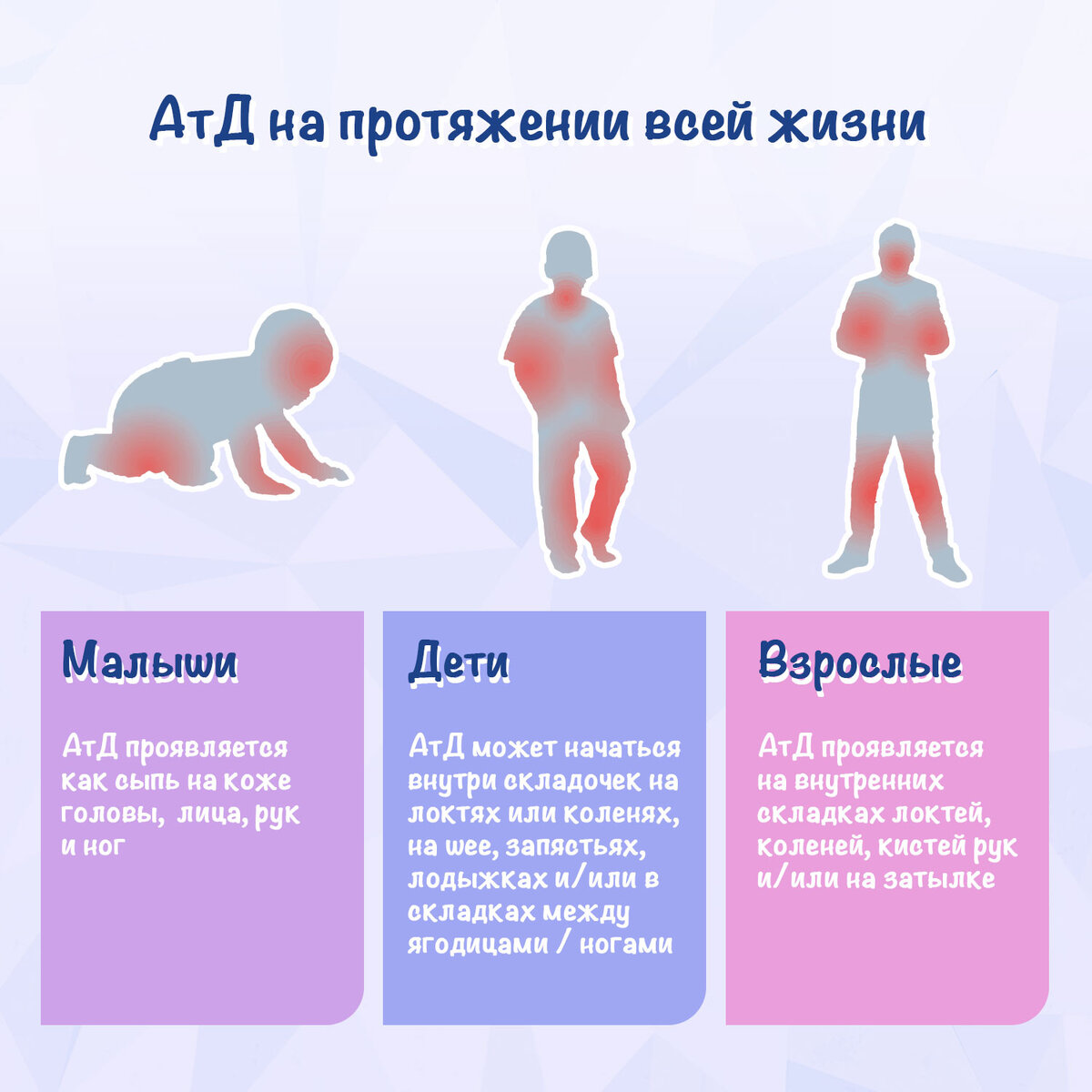 Атопический дерматит может проявляться по-разному, в зависимости от возраста. Места высыпаний отличаются у младенцев, детей и взрослых.