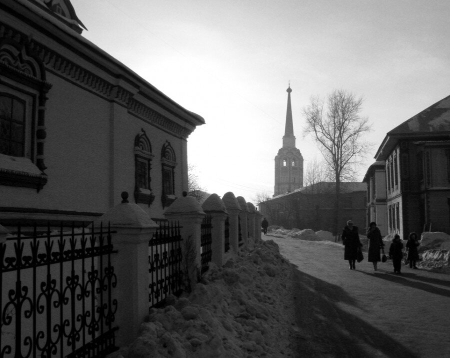 Соликамск – небольшой городок в 1200 км от Москвы. В первый раз я побывал в Соликамске лет 25 назад и запомнился он мне необычной башней. Так как командировка была скоротечной и напряженной, то больше я и не успел посмотреть. Но, почему-то всё тянуло туда. И вот - удача! В 2012 году меня снова туда направили в командировку: на три дня, один из которых - день приезда, наполовину в моем распоряжении. За прошедшее время Соликамск стал чище, пропали сараи и развалюхи, и я обнаружил большую площадь и ансамбль монастырей и церквей, а то и старых домиков, которые нанизаны на Набережную улицу. И было нереальное ощущение, что ты попал лет на четыреста назад, хотя, рядом с тобой, едут машины. Соликамск был основан в 1430 году, а звание города он получил уже в 1573 году - только на десять лет позже, чем был построен Храм Василия Блаженного в Москве. Как видно из названия – город тесно связан с добычей соли. А потом он оказался на торговом пути между Москвой и Китаем. Пусть вас не смущает распол