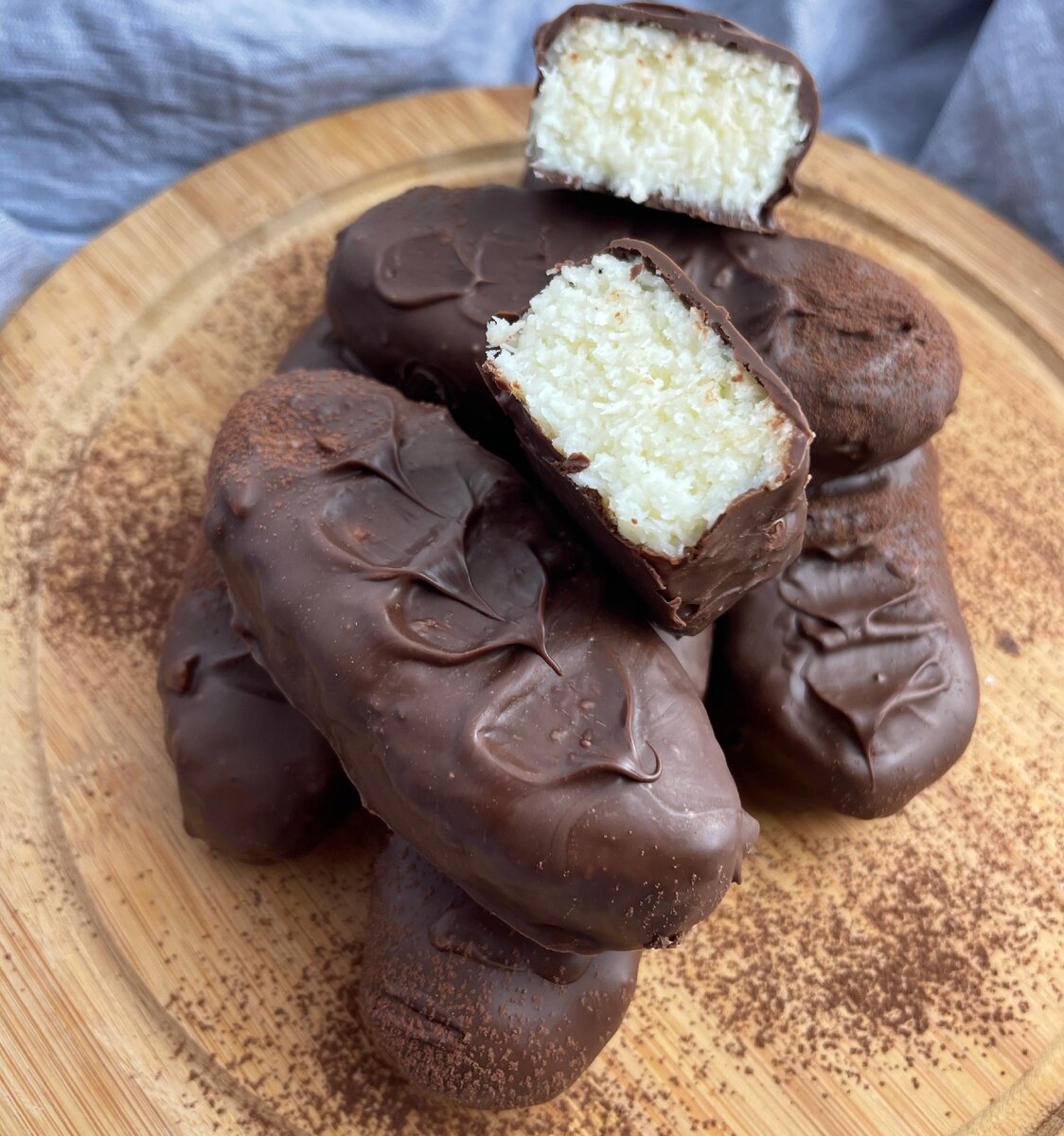 После холодильника, из кокосовой массы необходимо слепить батончики (у меня получилось 12). Сложить их на силиконовый коврик или пергамент и убрать в морозильную камеру на пару часов. Перед тем, как вынуть их оттуда, нужно сделать глазурь. Для этого просто следует растопить шоколад и в конце добавить растительное масло, перемешать. Достать батончики и купать их в шоколаде, помогая 2мя вилками. Обязательно стряхивать лишний шоколад, стуча об чашу вилкой. Складывать так же на силиконовый коврик или пергамент (не тарелку!).