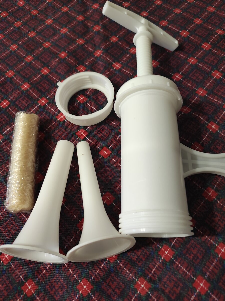Всем привет ! Несмотря на то, что имею большой колбасный шприц на 4,5 кг фарша , все-таки прикупила вот такой набор начинающего колбасника )