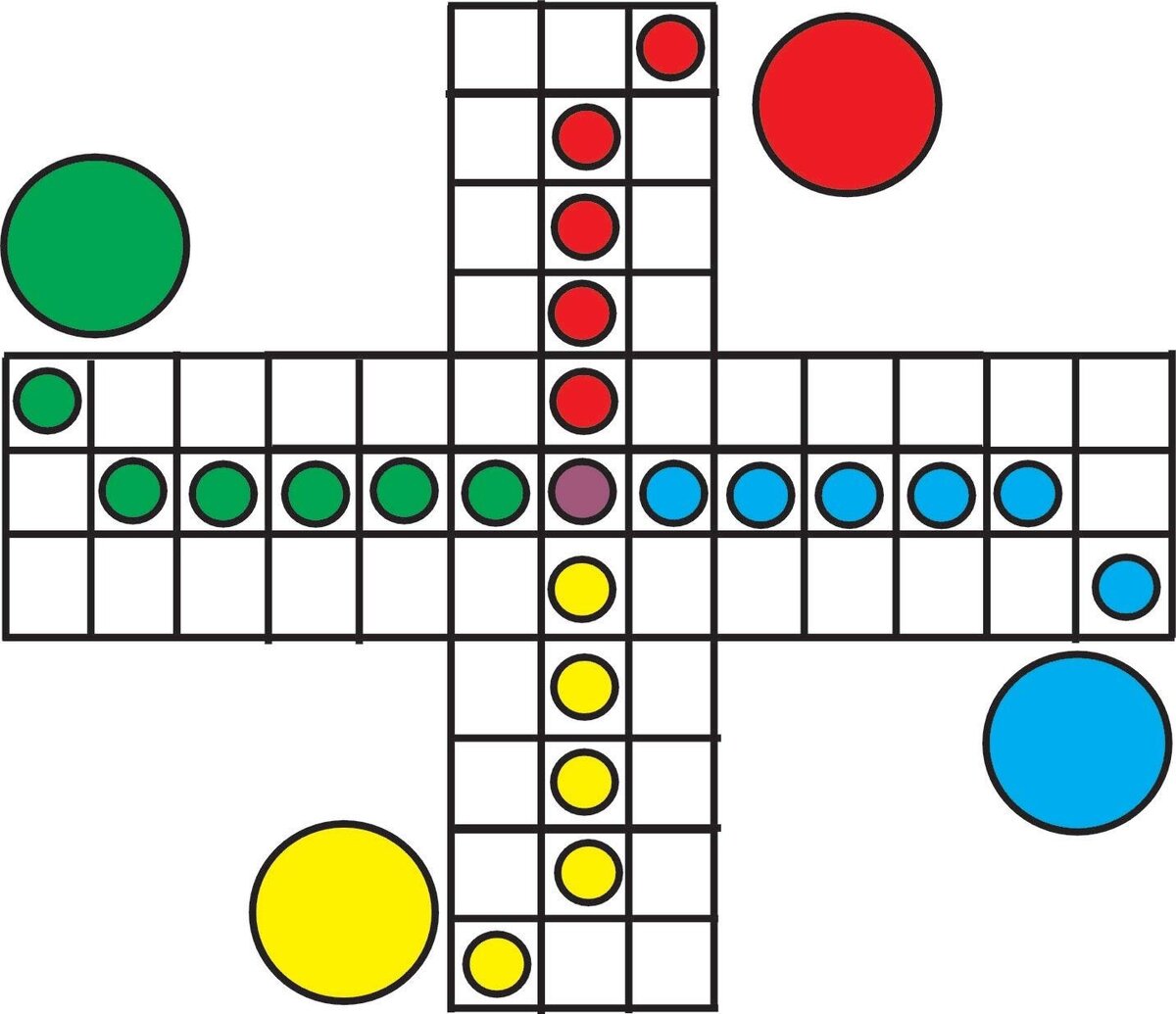 У каждого игрока база своего цвета, находящаяся у конца креста. Рядом с ней точка выхода на игровой поле. Задача игрока первым сделать своими фишками круг полю и финишировать по дорожке собственного цвета.