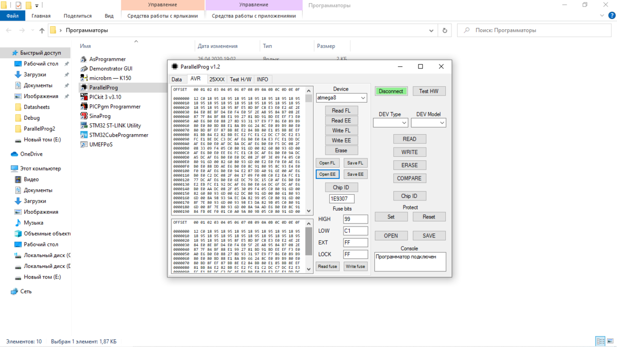 В случае работы с AVR - одноимённая вкладка. Как видите, на этой вкладке есть своё окошко выбора модели AVR, кнопки работы с памятью, окна просмотра данных Flash и EEPROM, отдельные кнопки для загрузки прошивки и EEPROM. При этом все кнопки в правой боковой части окна также активны, и их нежелательно нажимать во время работы с AVR. Возможно, позже перенесу их на первую вкладку, чтобы не мозолили глаза.