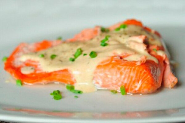 - Готовым соусом залить рыбу, поставить в горячую духовку.