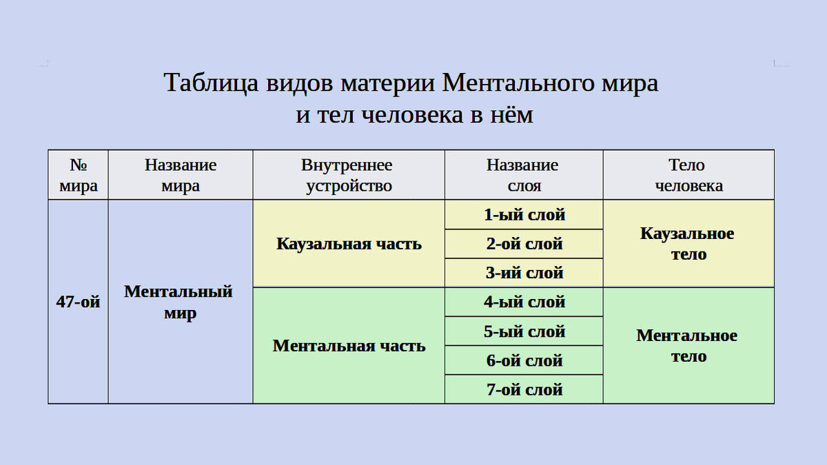 Сегодня мы будем рассматривать ментальное тело человека и его особенности. Из предыдущей статьи Азбуки Вам уже известно, что Ментальная часть Ментального мира состоит из 4-х видов материи по уровню плотности, а именно 4, 5, 6 и 7-го. Соответственно, ментальное тело человека состоит из этих же видов материи и предназначено для обитания в них.