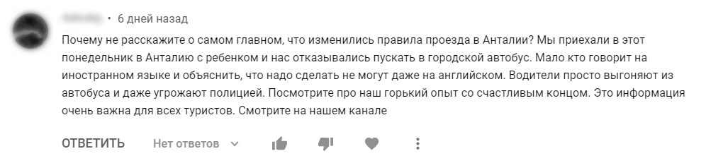 Уверена, что ситуация сильно преувеличена. Женщина явно хотела привлечь внимание к своему каналу и сгустила краски. Я бы даже посочувствовала, если бы она не возмущалась тем, что турки не говорят на русском. Почему они обязаны знать чужой язык? В Москве же водители трамваев не учили китайский, чтобы катать самых частых гостей столицы.
