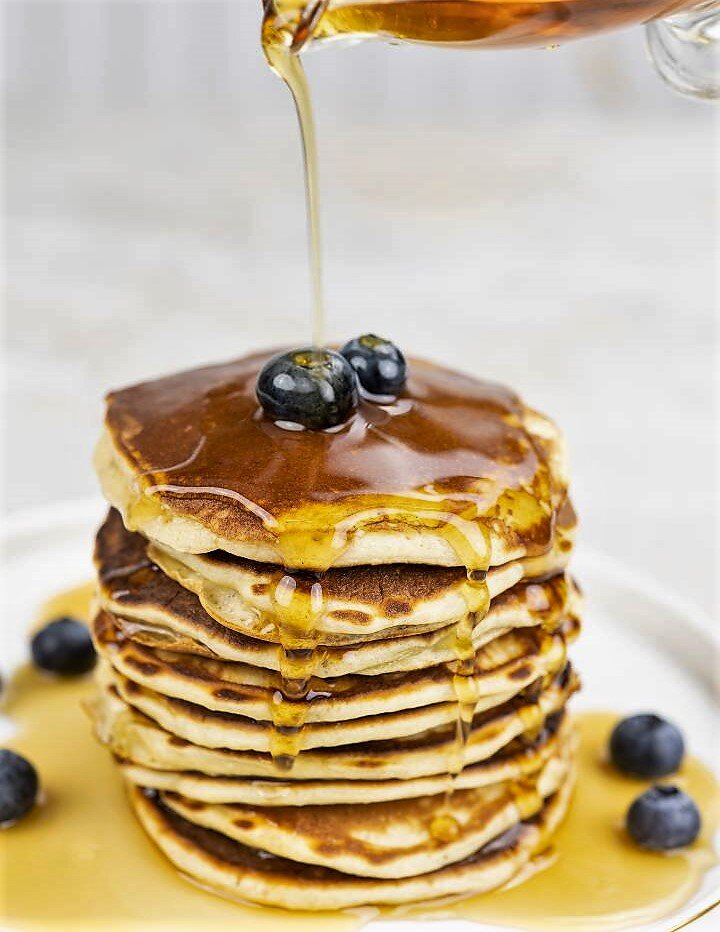 Готовые блины можно сложить друг на друга и залить кленовым сиропом или другим любимым сиропом (агава, тростник). Подойдут все: фруктовый, сливочный, шоколадный и ореховый. Блины одинаково вкусны и к фруктам, и к взбитым сливкам, и к мороженому.