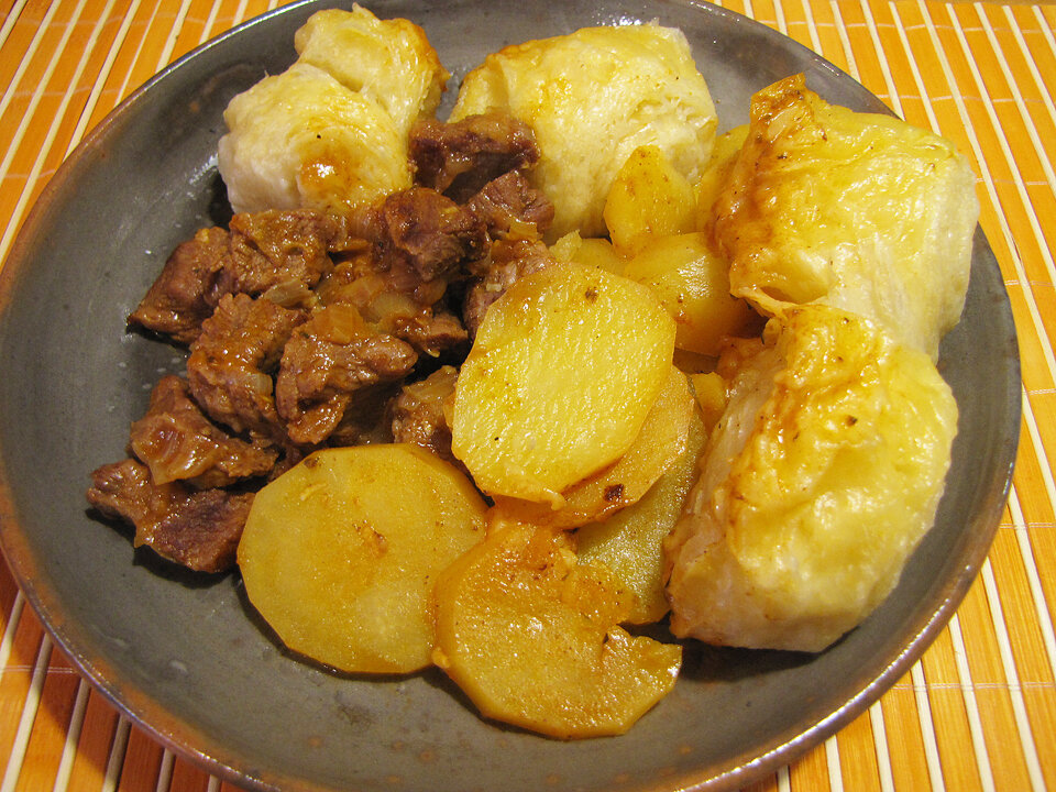 По истечении сорока минут можно осторожно открывать и удивляться, как сильно разбухло наше тесто. Штрудель готов. Накладываем на тарелку понемногу мяса с соусом, картофеля и кусочков теста, и начинаем жадно всё поедать. На мой взгляд, это невероятно вкусно.