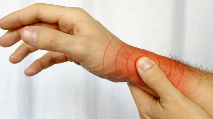 Болезнь проявляется болью в области запястья со стороны большого пальца, боль усиливается при попытке вытянуть большой палец, взять что -то в руку, при движении в суставах 1 пальца.
