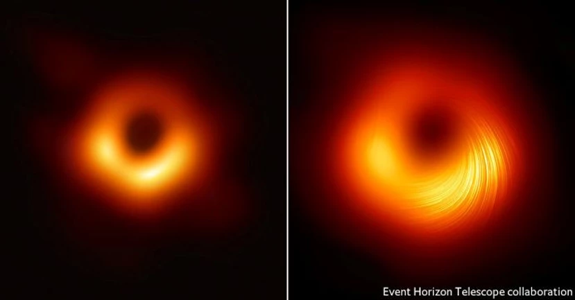 Теперь та же группа ученых опубликовала еще одно изображение той же черной дыры - справа, но на этот раз можно увидеть расположение ее магнитных полей более четко. Астрономы создали изображение, проанализировав поляризованный свет, выпущенный в горячую, намагниченную область пространства вокруг черной дыры. (Поляризованный свет колеблется только в одном направлении, по сравнению с обычным светом, который колеблется во всех случайных направлениях).