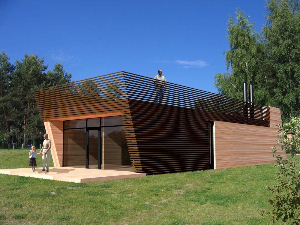 Домик для отдыха – баня продолжает эстетику виллы ”Сосна” , поскольку проектируется как дополнительное здание в ансамбле виллы. Активный угловатый объем, как и объем самой виллы смягчен фасадной отделкой из 2-х типов декоративной доски — светлой и темной.