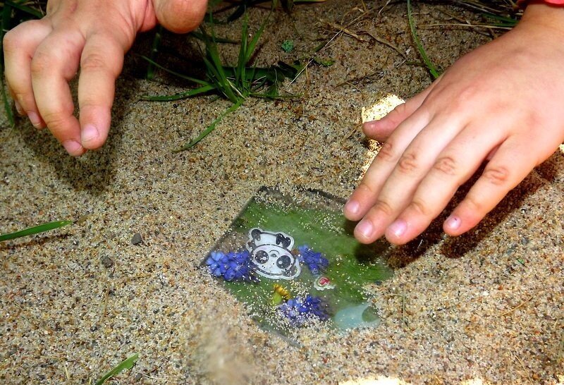 Положите немного красивых вещей в маленькую ямку: обертки от конфет, ленты, красивые перья, лепестки, листья, клочок ткани. Закрепите сверху кусочком стекла. Оставь его прикрытым надежно и красиво, как прозрачную воду подо льдом.