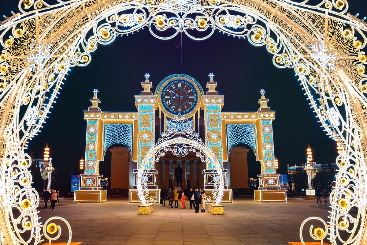 Для обширной территории ВДНХ, с ее арками, колоннами и павильонами, мы создали инсталляцию-часы "Время Рождества" высотой 18 м.