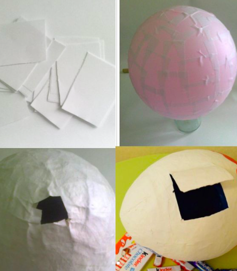 Рвём бумагу на небольшие кусочки - Первый слой приклеиваем к шарику с помощью просто воды. Второй и последующие с помощью пва, просто мажете кисточкой и клеите (не жалейте клея).