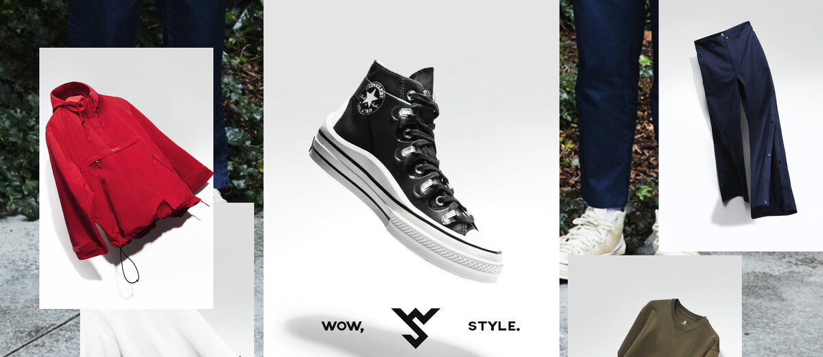 В линейку вошли обновленная модель кедов Chuck 70 с увеличенным краем подошвы и силиконовым верхом, футболки, брюки-карго с кнопками, толстовки и анораки из нейлона.