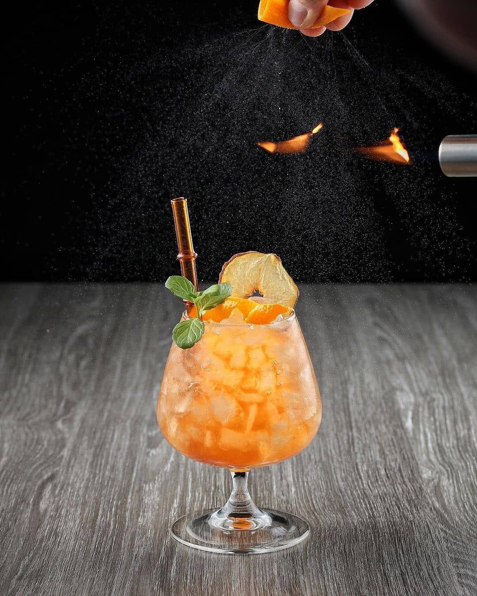 Шейк. Гарниш цедра апельсина, сушеный персик и мята.