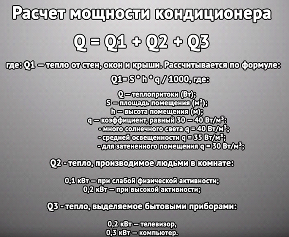 Для определения производительности кондиционера можно воспользоваться сложными формулами, учитывающими количество окон, число людей в помещении, солнечная или теневая сторона в комнате.