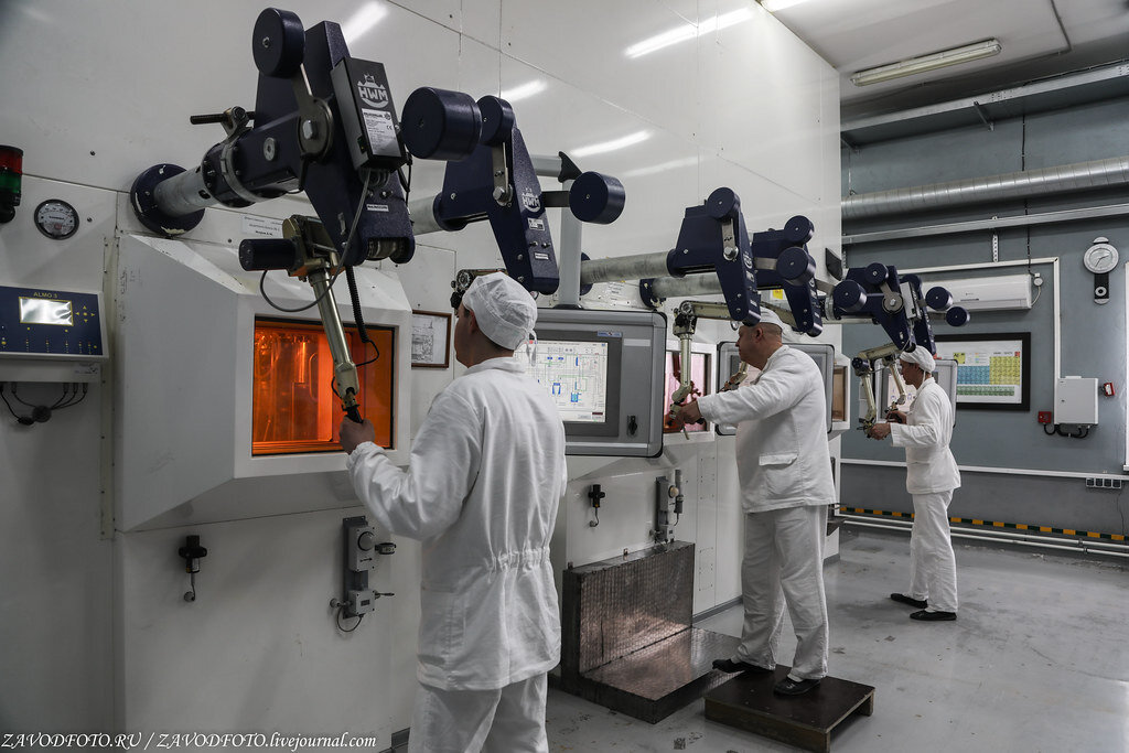 А это мы уже в другом здании, да, тут у каждого реактора свой дом, в Отделении радионуклидных источников и препаратов. Здесь уже история больше даже не про науку, а про производство, правда, весьма технологичного. Основу научно-технологической базы данного подразделения НИИАР составляют защитные камеры и боксы, есть и специальные лаборатории, конечно, вот мы в одной из них. А так Отделение имеет 34 защитных камеры и более 30 защитных боксов. Биологическая защита 22-х камер позволяет безопасно работать с радиоактивными материалами активностью до 100000 кюри, остальных камер - от 1000 до 20000 кюри. В зависимости от типов боксов их биологическая защита позволяет безопасно работать с радиоактивными материалами активностью до 100 кюри.