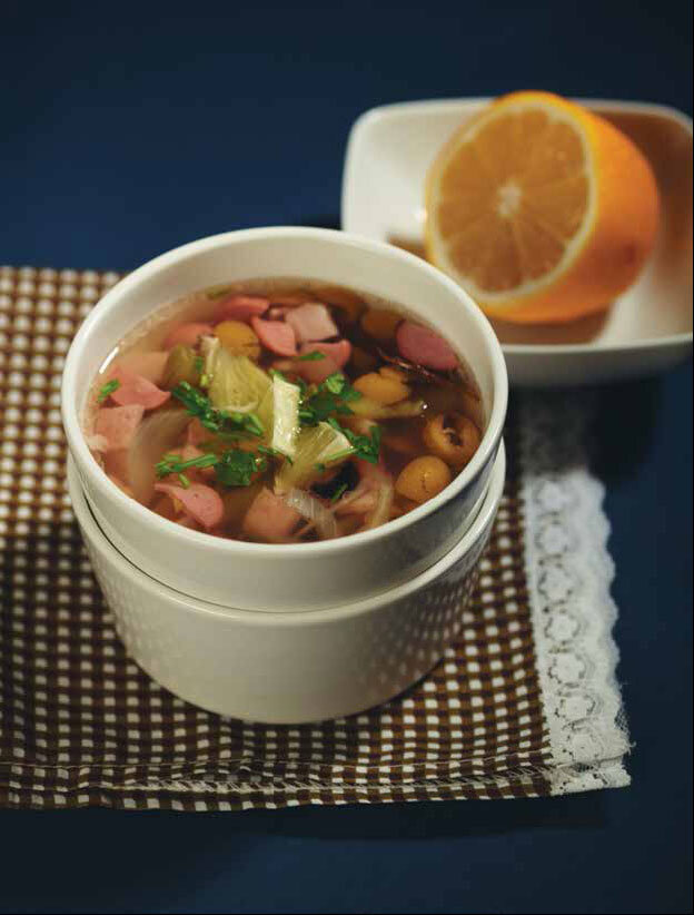 - Отварную говядину, ветчину, сосиски и отварные говяжьи почки нарезать тонкими ломтиками, положить в бульон, довести до кипения. Добавить обжаренные лук и огурцы, каперсы вместе с рассолом, перец горошком, лавровый лист и соль. Варить ещё 8–10 минут.