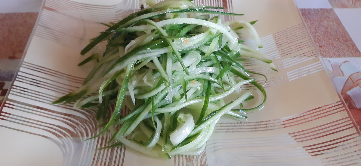 Огурец хорошо вымыть и натереть при помощи тёрки для корейской моркови . Стараться держать огурец параллельно тёрке , так соломка получается длиннее .