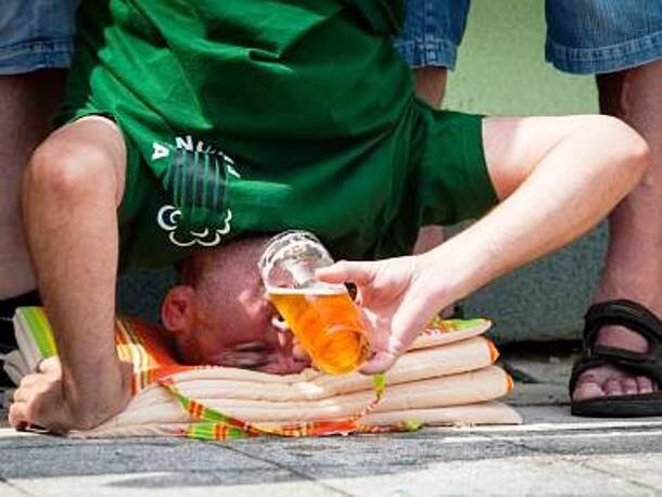 Питьё пива стоя на голове является одним из нескольких сумасшедших дисциплин ежегодного развлекательного спортивного чемпионата под названием «Неделя Чудес» , который проходит в Опаве, Чехия. Среди других турниров можно выделить плевание оливками, а также кидание и ловлю яиц.
