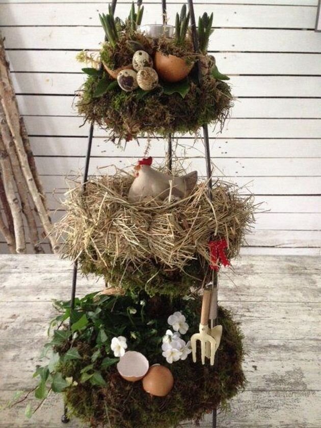 В таких композиция много натурального - льна, дерева, соломы, некрашеных яиц, декорированных мешковиной или джутом стеклянных баночек.