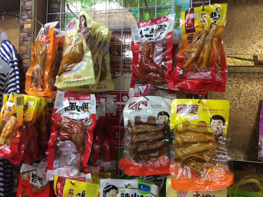 Вот первое, что вы встречаете в Китае - полки с неведомой фигнёй. Я не знаю, везде это так или только в туристической зоне, но магазины просто переполнены различными закусками. Преимущественно под пиво. Тут тебе и мясо, и соевые продукты, и какие-то растения, и чёрт знает что ещё. К китайским магазинам мы ещё вернёмся.