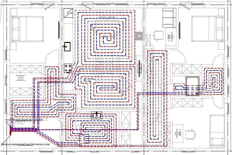 В итоге в доме будет размещено 11 радиаторов - под каждым окном, кроме маленьких в санузлах. Радиаторы небольшие, теплоотдачей до 600 Вт. Только под панорамным окном гостиной радиатор размерами 2000х300 мм будет отдавать 1490 Вт. Тёплых полов вышло 6 контуров, которые примыкают друг к другу и покрывают около 60 % площади полов в доме.