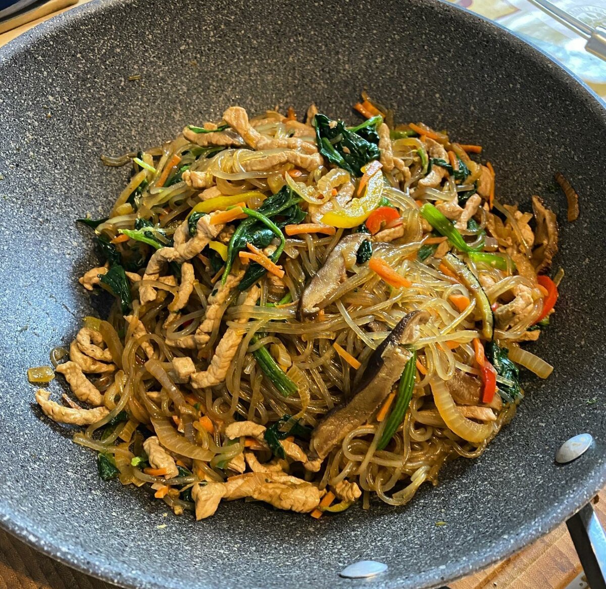 Японский вариант Чапче готовится из любимой японцами конжаковой лапши ширатаки. Она обладает приятной текстурой, как и лапша из батата. (Кстати, оба эти вида лапши прозрачные)