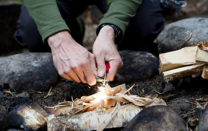 Добыть огонь можно при помощи фонарика, правда его придется разбить. Суть в том, чтобы освободить и оголить дугу лампочки. После этого подносим ее к сухому труту и нажимаем на кнопку «включить». Электрический заряд сделает всю работу.