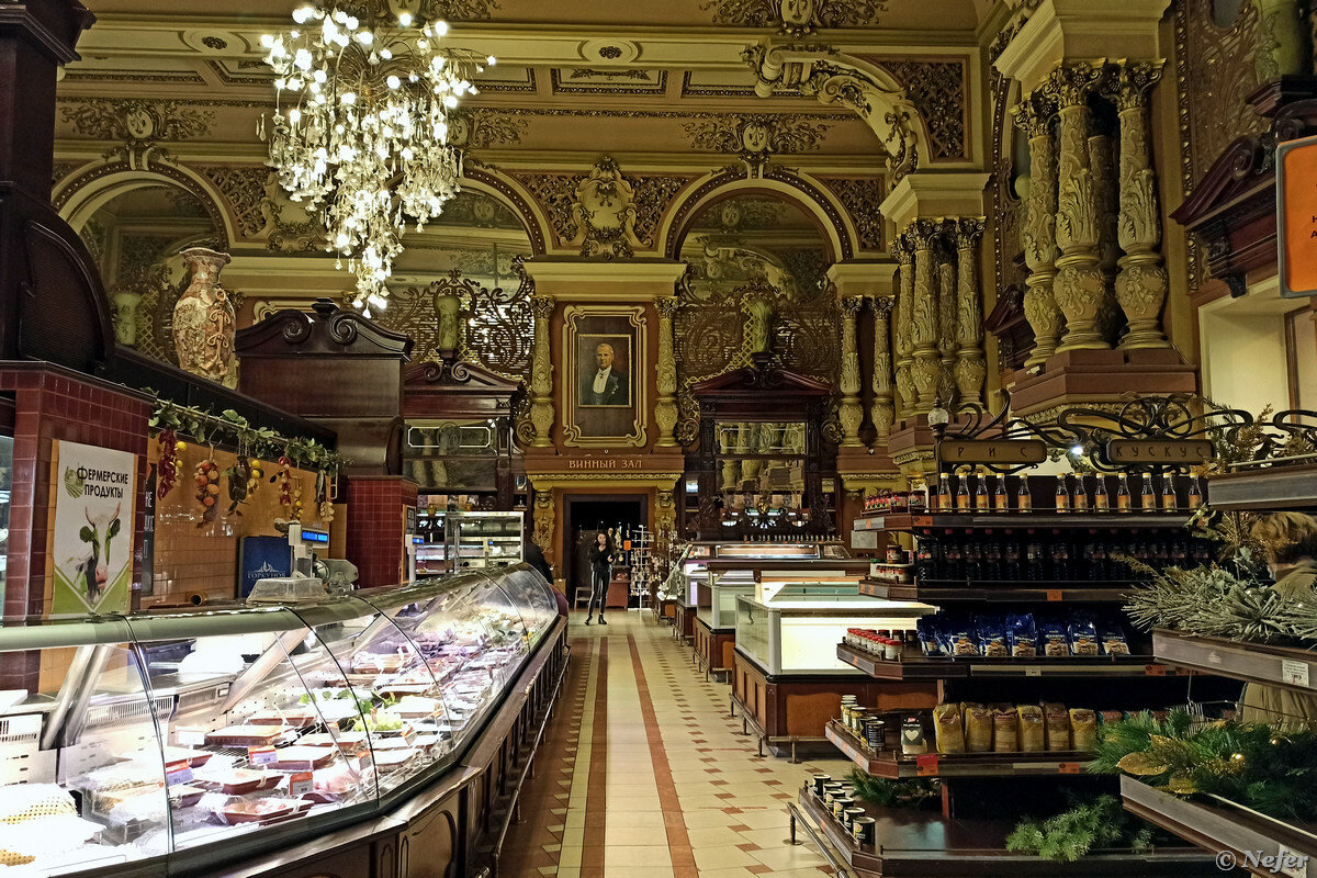 Магазин открыт купцом Григорием Елисеевым в 1901 году и всегда славился роскошными интерьерами, а также богатым ассортиментом. Каждый из продавцов владел несколькими иностранными языками, они консультировали покупателей и собирали им покупки, которые потом выносили к каретам швейцары. Особое внимание отводилось выкладке товара. Елисеев придумал выстраивать пирамиды из продуктов, это было презентабельно и по его мнению символизировало изобилие. У магазина была своя пекарня, цех обжарки кофе, в подвалах хранились соления и варенье собственного производства, вроде даже делали колбасу. В годы советской власти магазин назывался "Гастроном № 1", однако в народе он всегда был Елисеевским.