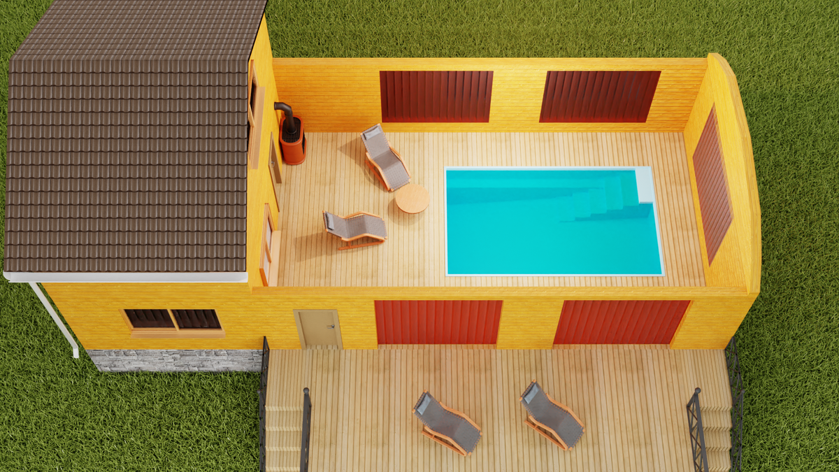 3. У меня много друзей, и мы любим встречаться. Поэтому курорт должен предусматривать лаунж зону, где можно разместить лежаки, столик и просто проводить время. Помимо закрытой обогреваемой части курорта должна быть еще открытая терраса, на которой можно загорать летом. В эту же террасу можно впоследствии установить небольшую купель с гейзером. для купания зимой в горячей воде.
