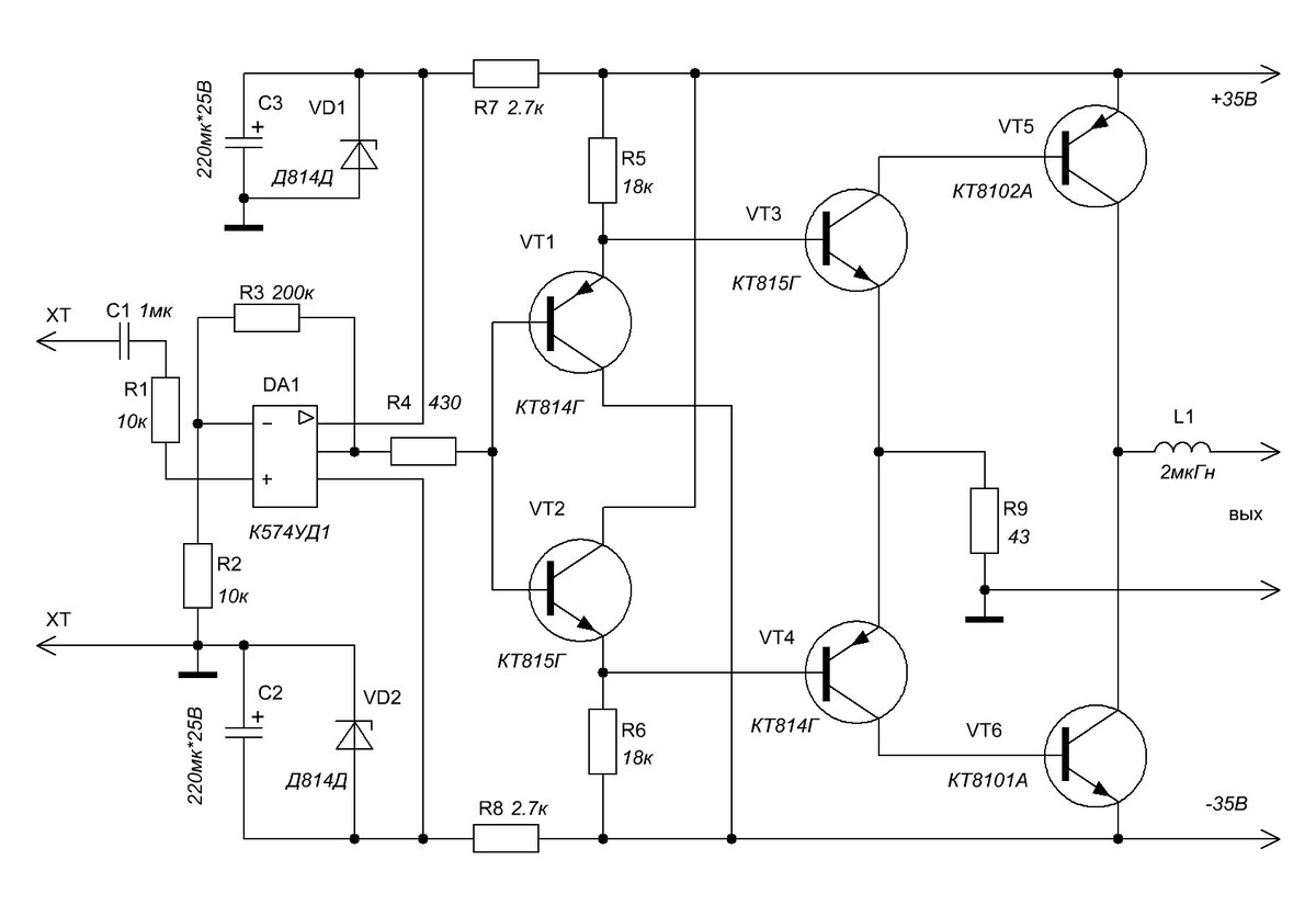 Усилитель содержит три каскада: неинвертирующий усилитель на операционном усилителе DA1, предвыходной (транзисторы VT1,VT2), выходной (транзисторы VT3 –VT6). Транзисторы VT 3, VT 4 включены по схеме с ОЭ, они охвачены ООС по току (резистор R 9) и имеют большие внутренние сопротивления. СЛЕДОВАТЕЛЬНО, для выходных транзисторов VT5,VT6 ОНИ ЯВЛЯЮТСЯ ИСТОЧНИКАМИ ТОКА.
